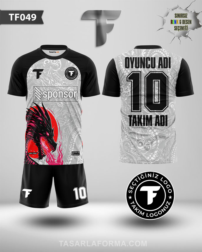 Gri ejderha desenli futbol forması, online tasarım aracı ile kişiselleştirilebilir. İhtiyacınıza göre şort ve çorap eklenir.