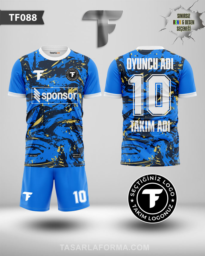 Mavi fırça desenli futbol forması, halı saha takımınız için özel üretilir.