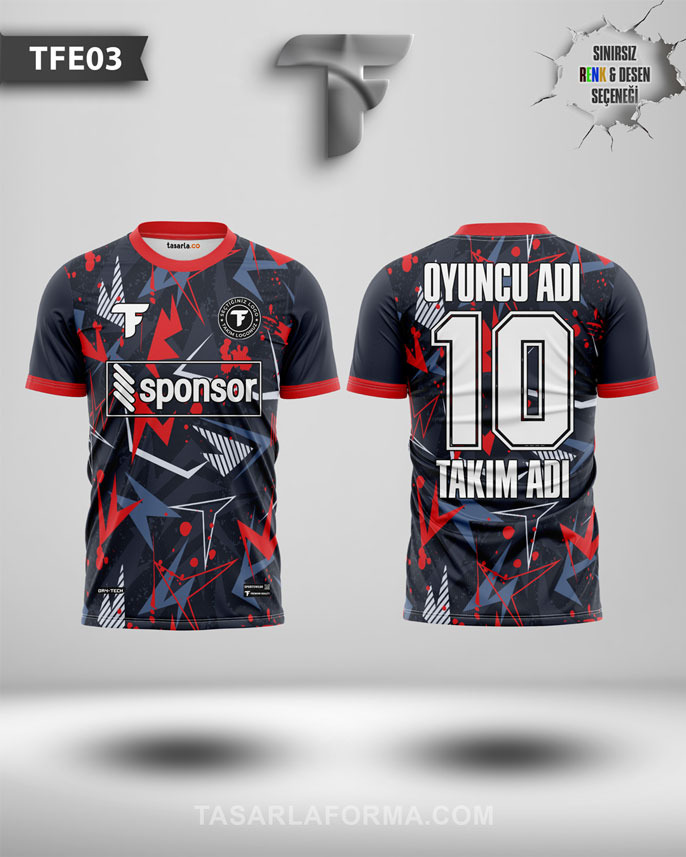 Kırmızı geçişli lacivert e-spor forması, profesyonel takımlar için özel olarak tasarlanır. Dijital üretim kalitesiyle 7–10 iş gününde teslim edilir, WhatsApp’tan ücretsiz tasarım olanağıyla kişiye özel hale getirilir.