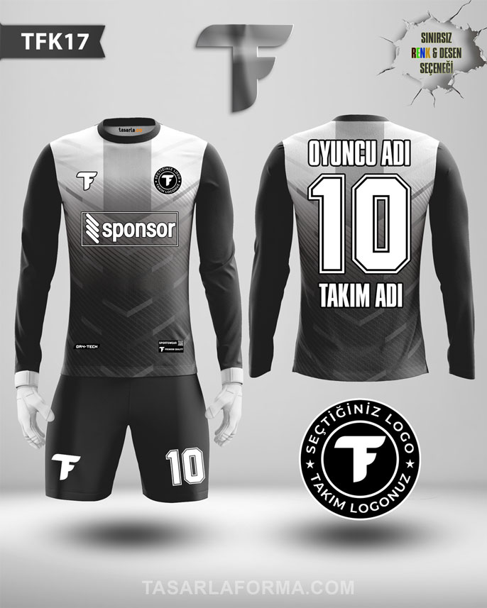 Uzun kollu gri-beyaz desenli siyah kaleci forması, takımınıza özel dijital tasarım ile hazırlanır.