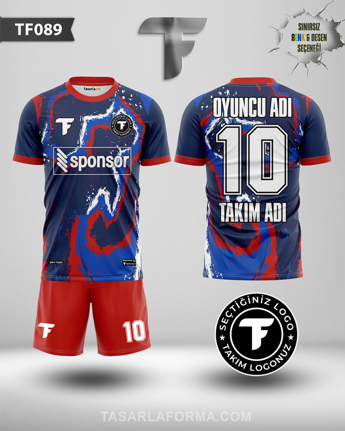 Kırmızıdan laciverte geçişli özel deseniyle fark yaratan TF0011, sahada profesyonel bir görünüm isteyen takımlar için üretildi. Nefes alan Mikro İnterlok ve Kappa Mesh Yağmur Desen kumaşları sayesinde terletmez, maksimum konfor sunar. İsim, numara ve logo baskısıyla tamamen özelleştirilebilir. WhatsApp üzerinden ücretsiz tasarım desteğiyle hayalindeki formayı hemen oluştur!