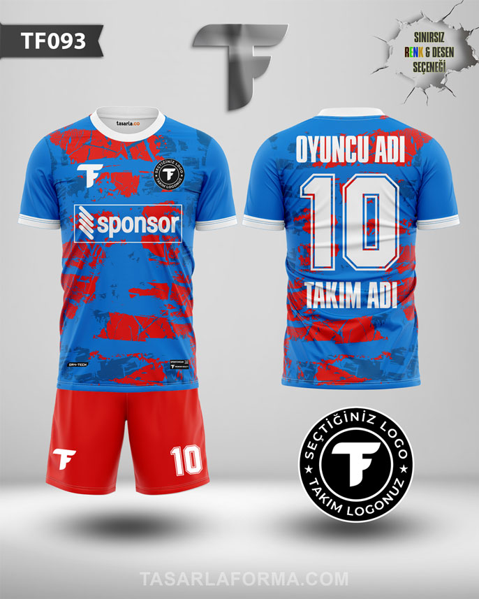 Kırmızı parça desenli mavi futbol forması, takımınıza özel üretim seçeneği sunar.