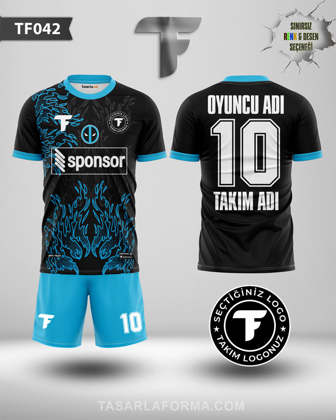 Mavi geçişli siyah futbol forması, takımınıza profesyonel ve şık bir görünüm kazandırır. İhtiyacınıza göre şort ve çorap eklenerek takım halinde üretim yapılır.