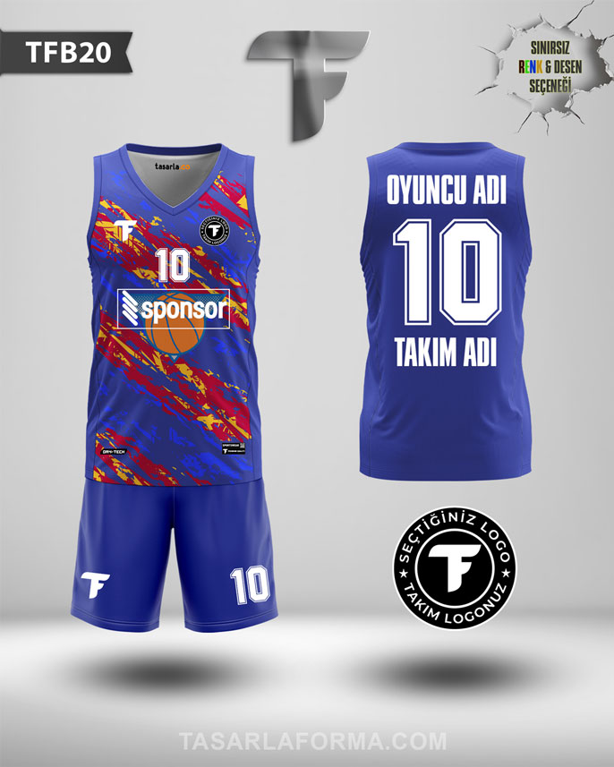 TFB20 – Renkli Fırça Desenli Mavi Basketbol Forması, enerjik yapısı ve dikkat çekici tasarımıyla profesyonel takımlar için geliştirilmiştir.