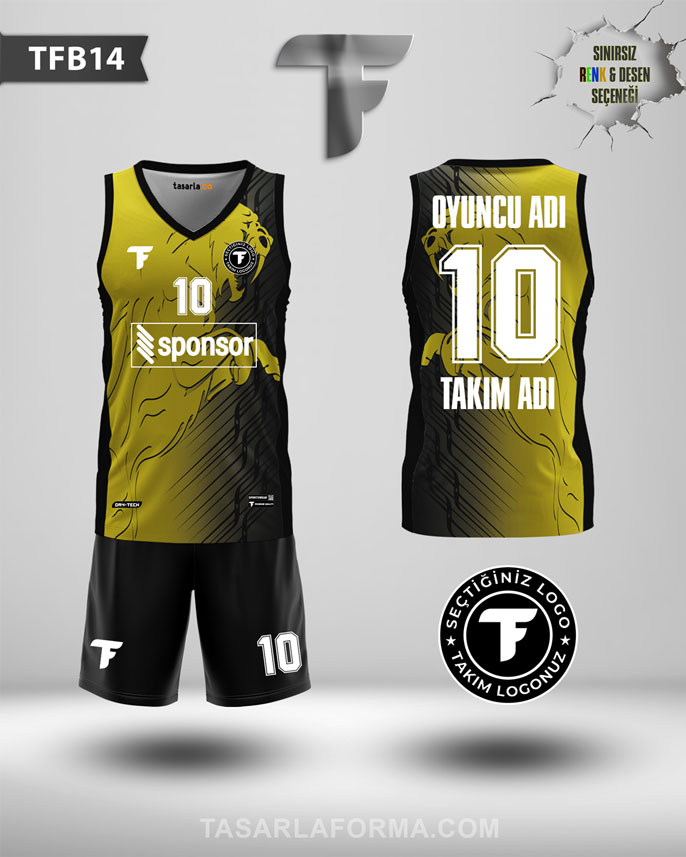 TFB14 – Sarı Aslan Desenli Siyah Basketbol Forması, takım ruhunu güç ve cesaretle birleştiren özel bir tasarımdır.