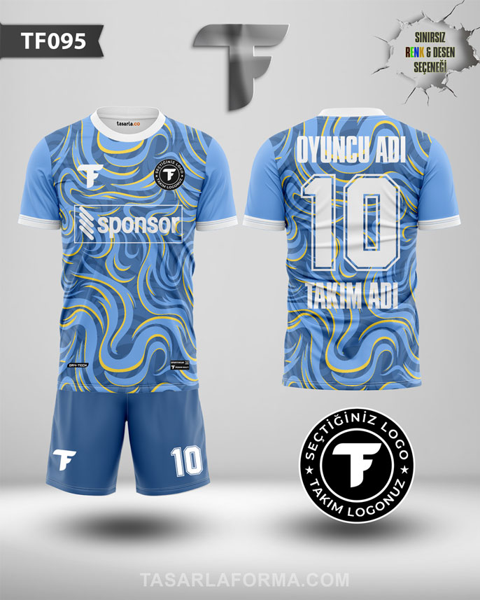 Sarı-mavi desenli futbol forması, dijital baskı teknolojisi ile takımınıza ve kişiye özel üretilir. Online tasarım aracı ile isim, numara ve logolarınızı ekleyebilir, renk ve desenleri özgürce özelleştirebilirsiniz. Forma, ihtiyacınıza göre şort ve çorap eklenerek takım halinde üretim yapılır. Profesyonel, nefes alan kumaş seçenekleri sahada maksimum konfor ve dayanıklılık sağlar. Takımınız uyumlu ve şık bir şekilde sahada yer alır.