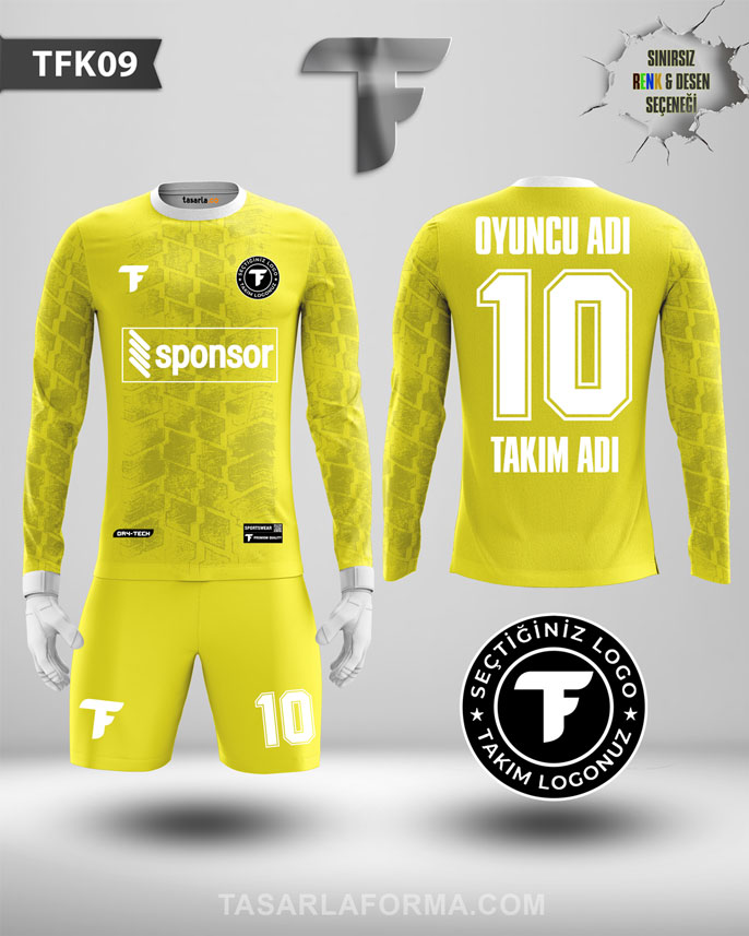 Uzun kollu sarı geometrik desenli yeşil kaleci forması, takımınıza özel dijital tasarım ile hazırlanır.