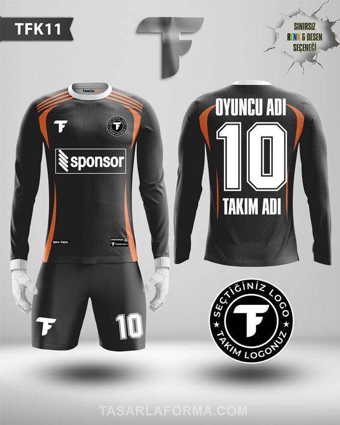 Uzun kollu turuncu fırça desenli siyah kaleci forması, tamamen kişiye özel tasarlanabilir.